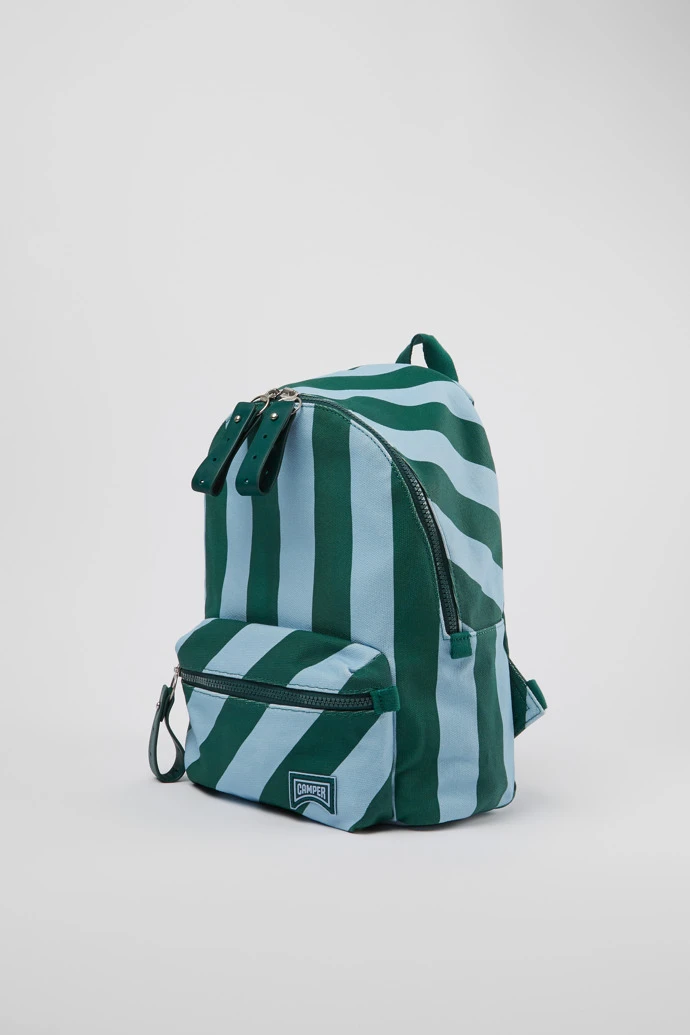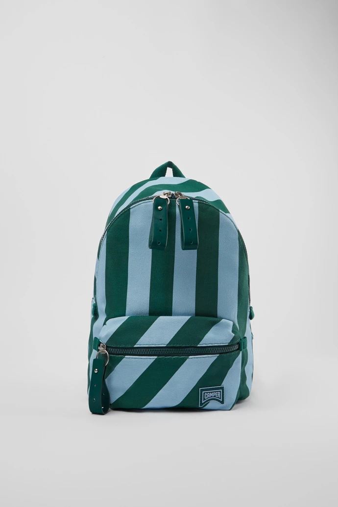 Small blue and green striped recycled cotton backpack with small front compartment.