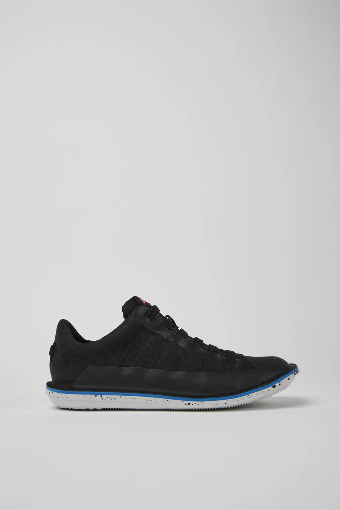Black shoe for men. 80% recycled PET fabric upper and elastic laces. White and blue outsole made of 51% recycled EVA.