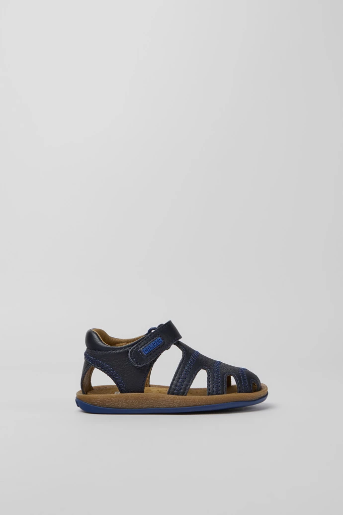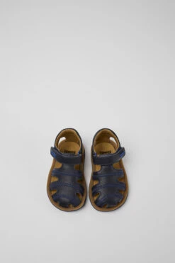Blue leather kids’ sandals with hook-and-loop closing system and 100% rubber outsoles (20% recycled).