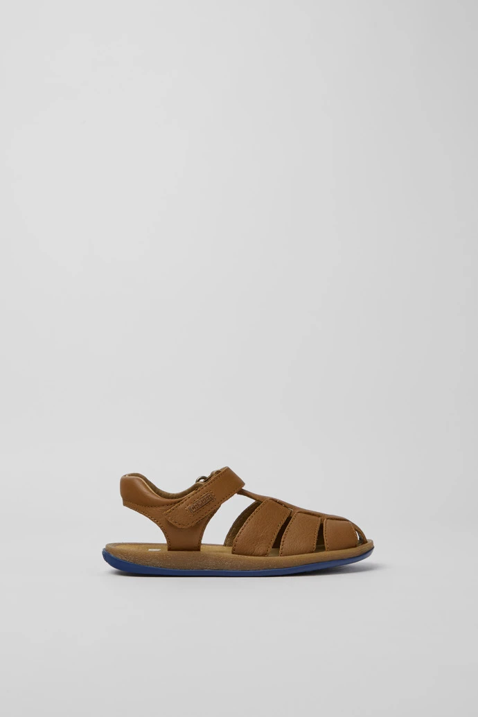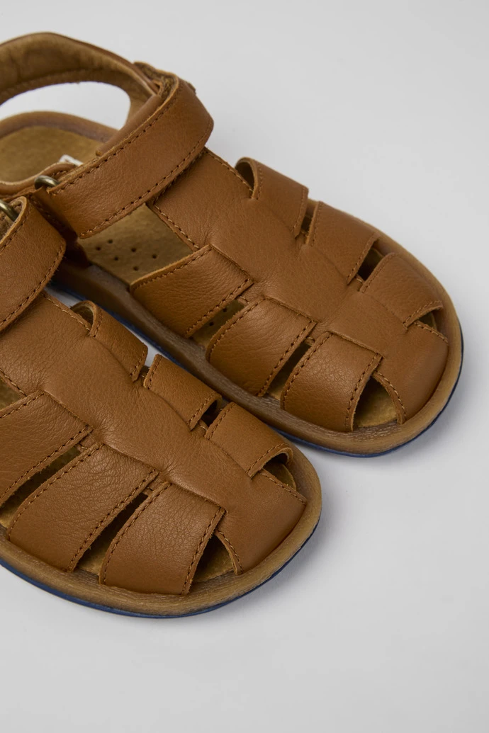 Brown leather kids’ sandals with hook-and-loop closing system and 100% rubber outsoles (20% recycled).