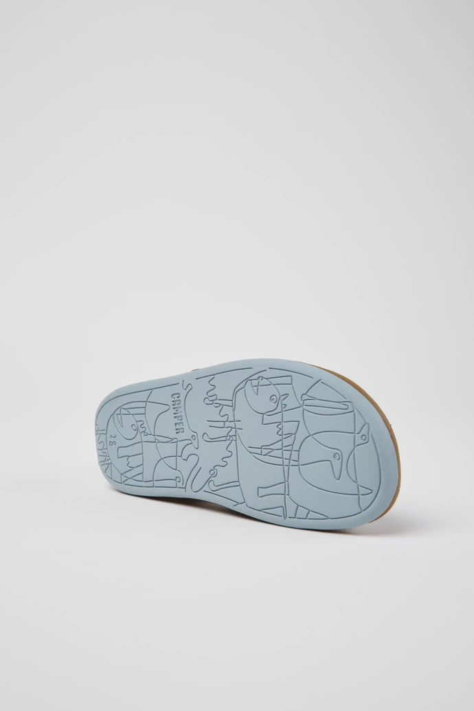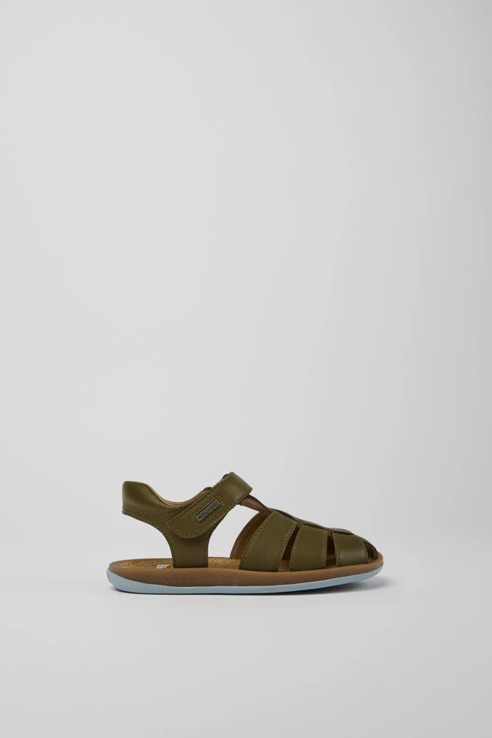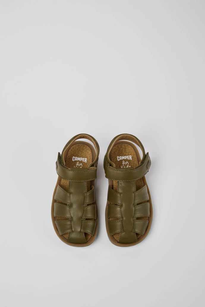 Green leather kids’ sandals with hook-and-loop closing system and 100% rubber outsoles (20% recycled).