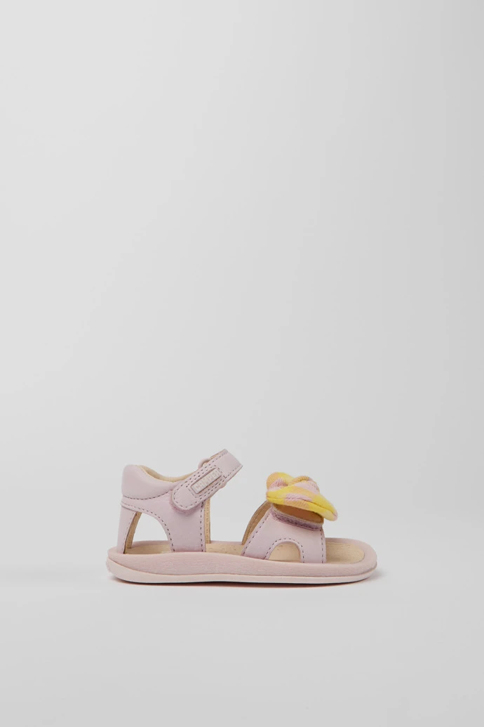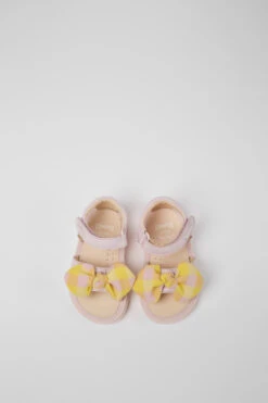 Pink leather and yellow textile girls’ sandals with hook-and-loop closing system and 100% rubber outsoles (20% recycled).