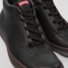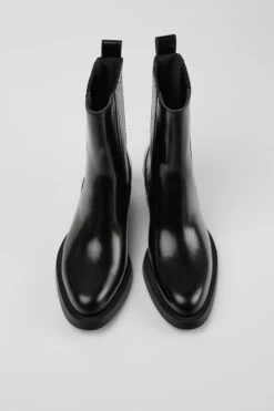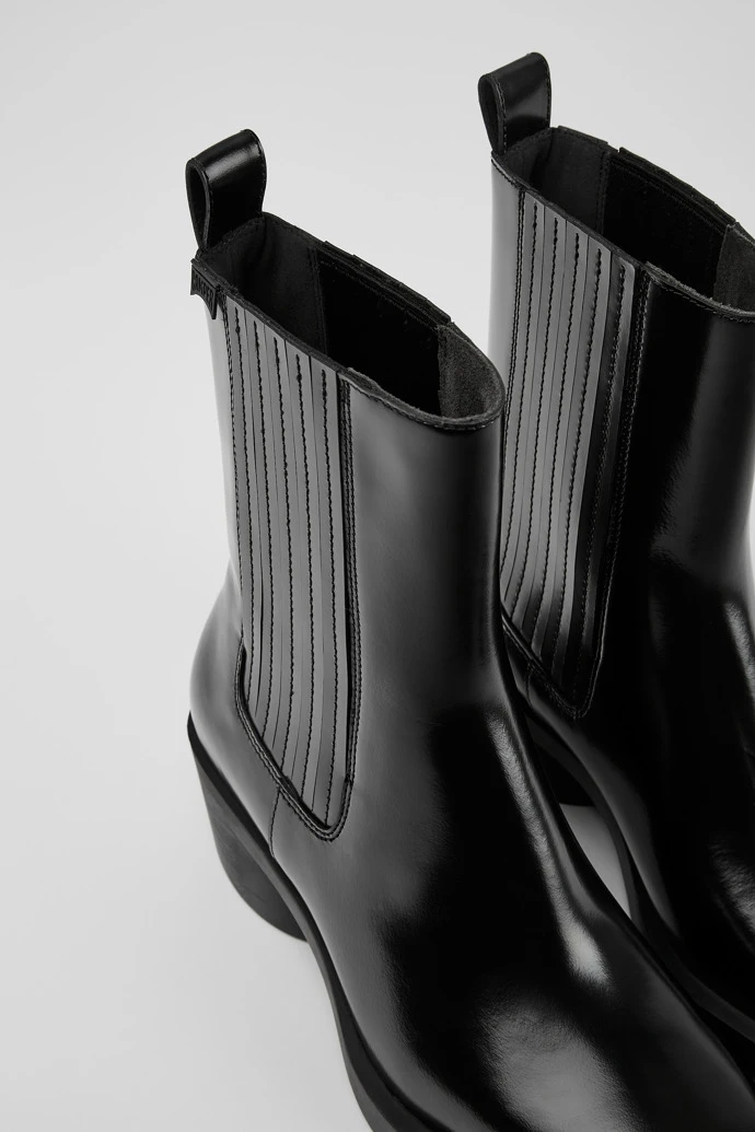 Black leather women’s boots with OrthoLite® Recycled™ footbeds and rubber outsoles (20% recycled).