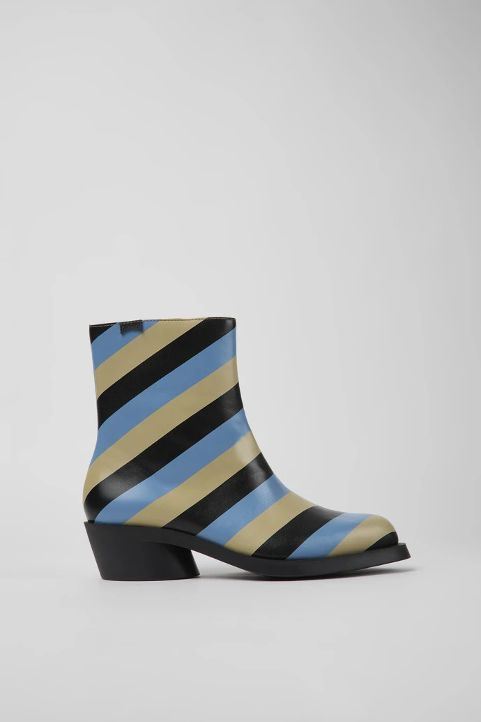 Multicolored striped leather women’s boots with OrthoLite® Recycled™ non-removable footbeds and rubber outsoles (20% recycled).