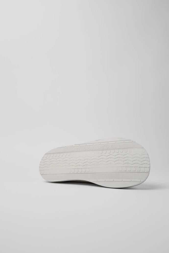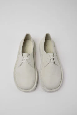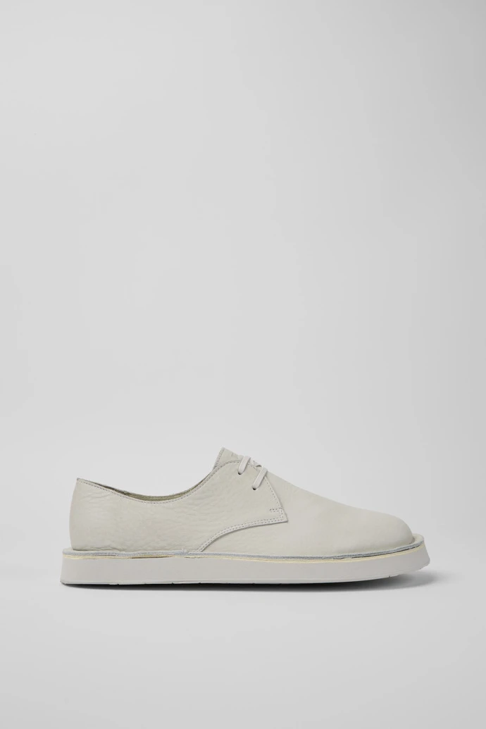 White non-dyed leather lace-up men’s shoes with 100% rubber outsoles (51% natural).