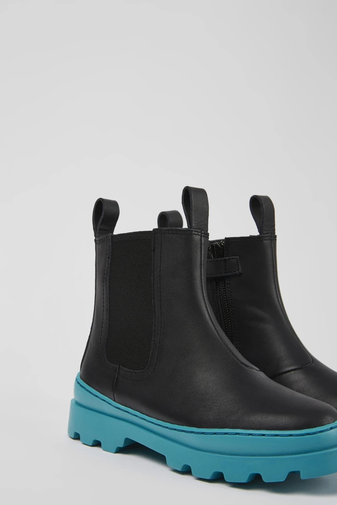 Black leather kids’ Chelsea boots with OrthoLite® Recycled™ removable footbeds and rubber outsoles.