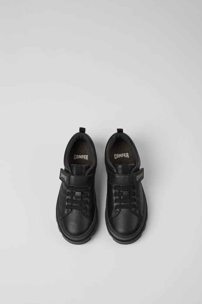 Black leather kids’ shoes with OrthoLite® Recycled™ removable footbeds and rubber outsoles.