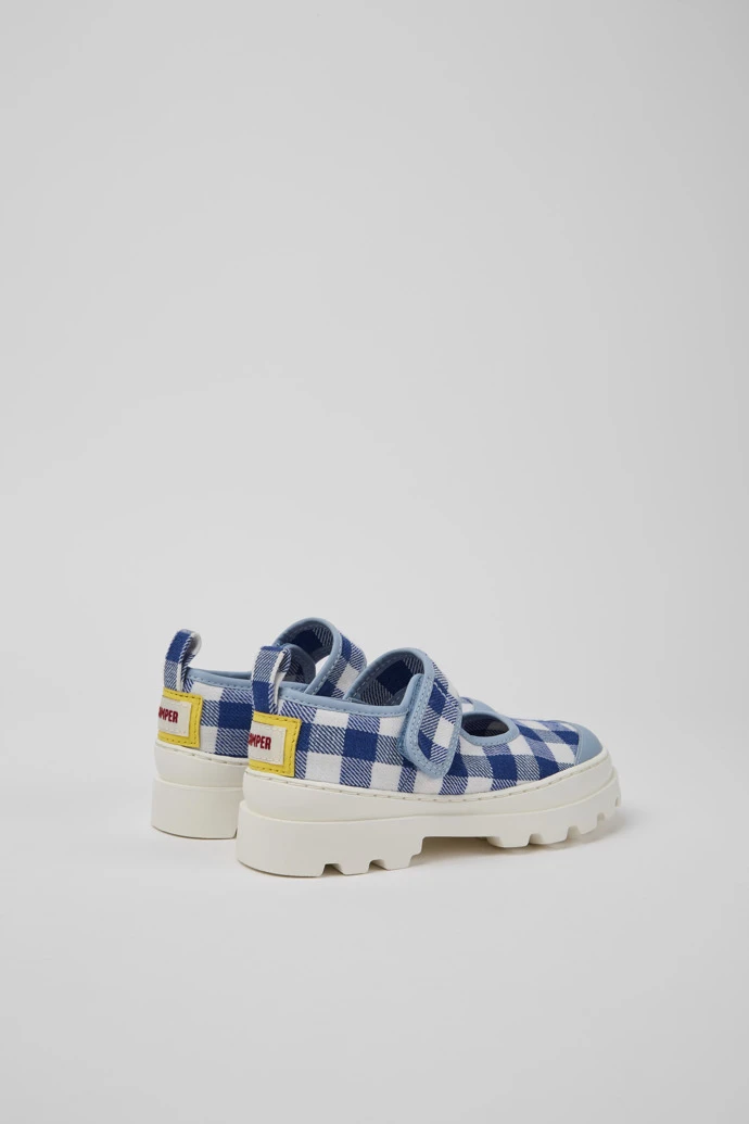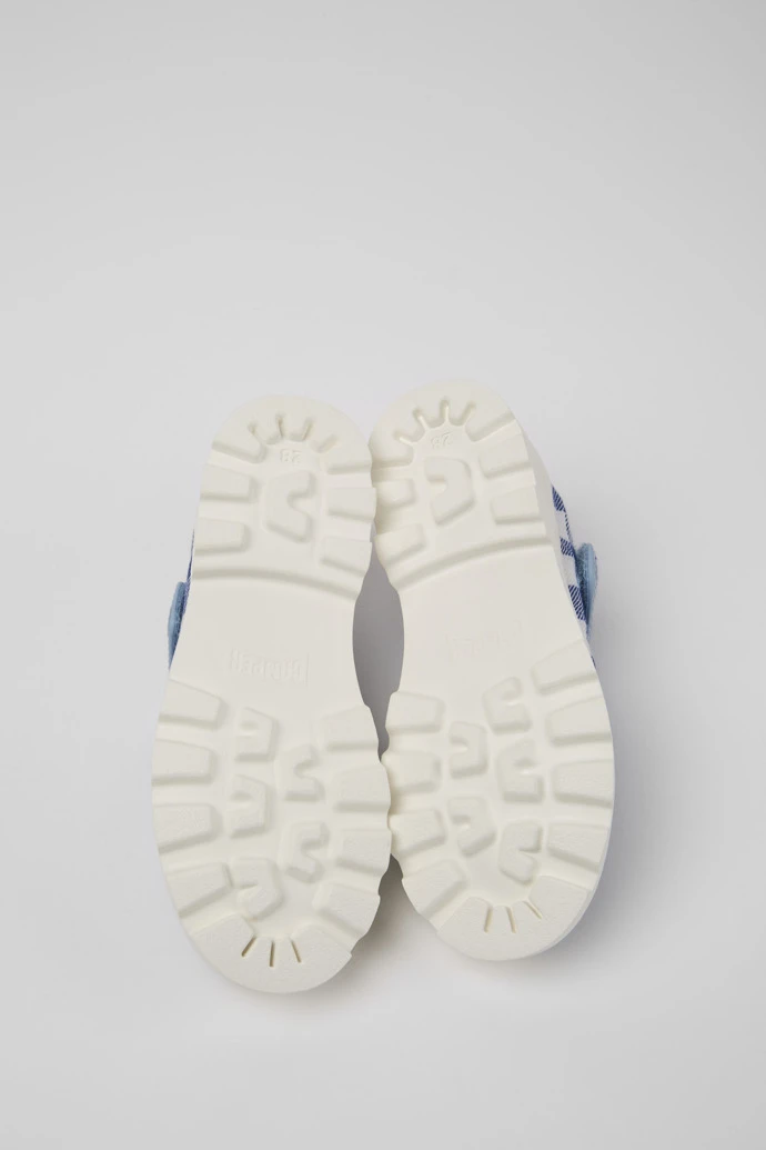 Blue and white Mary Jane kids’ shoes made of 65% recycled cotton and 35% recycled polyester with hook-and-loop closing system and 100% rubber outsoles.