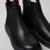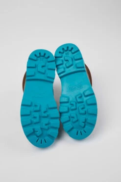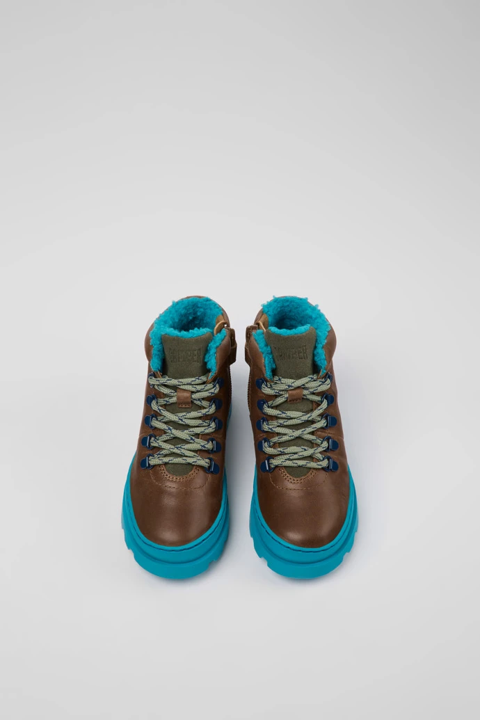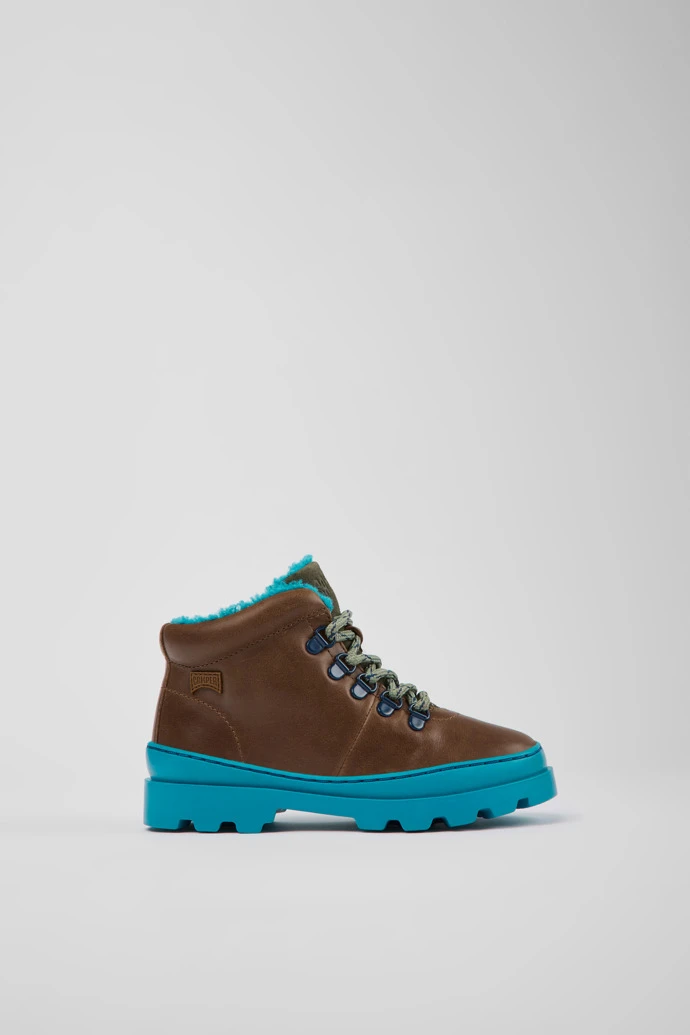 Brown leather and nubuck kids’ ankle boots with faux fur, OrthoLite® Recycled™ removable footbeds, and rubber outsoles.