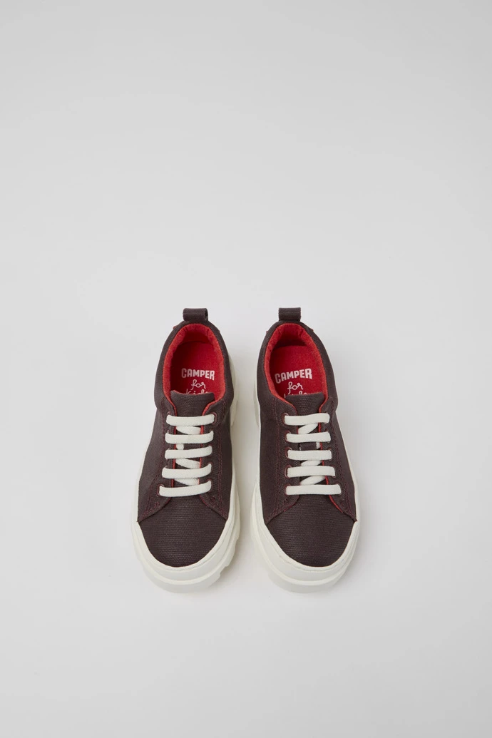 Burgundy organic cotton kids’ shoes with recycled PET laces and 100% rubber outsoles.