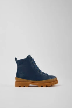 Dark blue leather kids’ ankle boots with OrthoLite® Recycled™ removable footbeds and rubber outsoles.