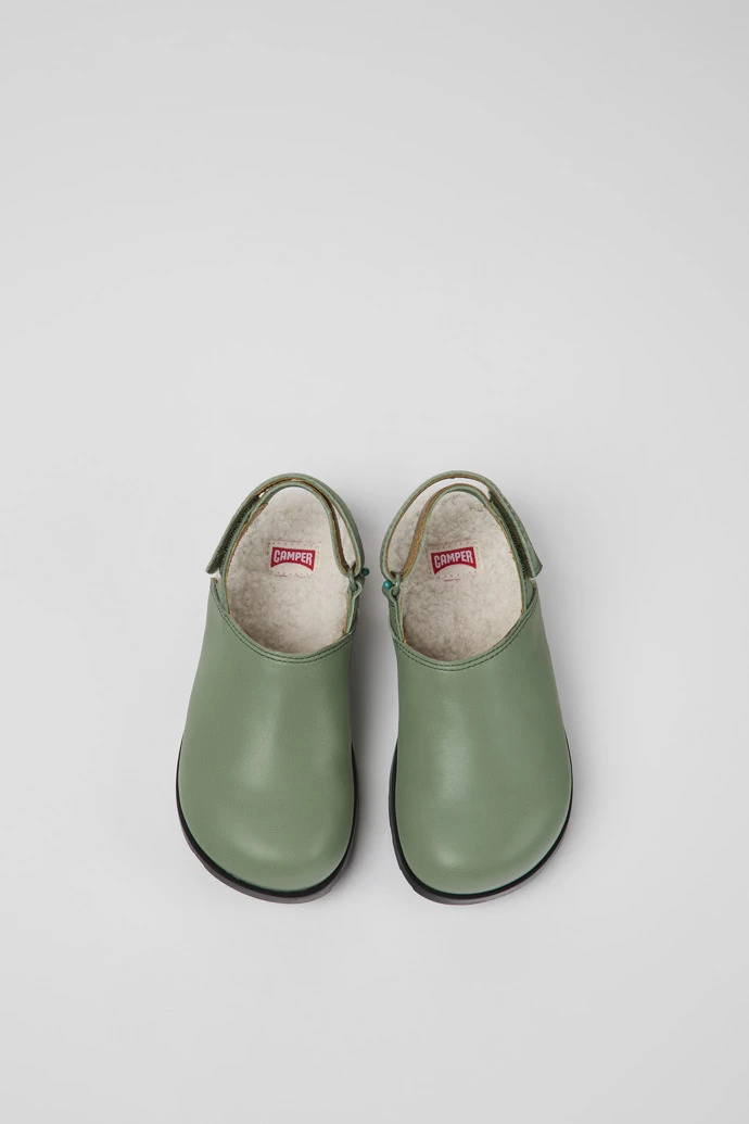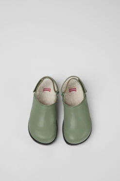Green leather kids’ clogs with an easy-fit hook-and-loop closing system, cushioned anatomic EVA footbeds, and rubber outsoles.