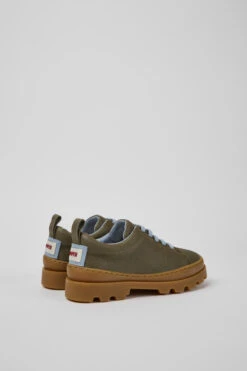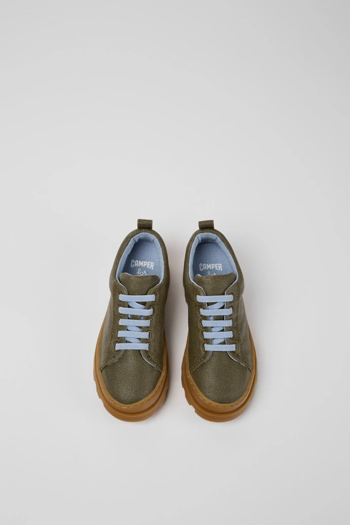 Green organic cotton kids’ shoes with recycled PET laces and 100% rubber outsoles.