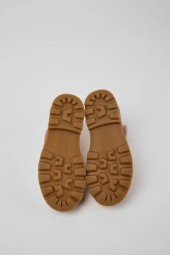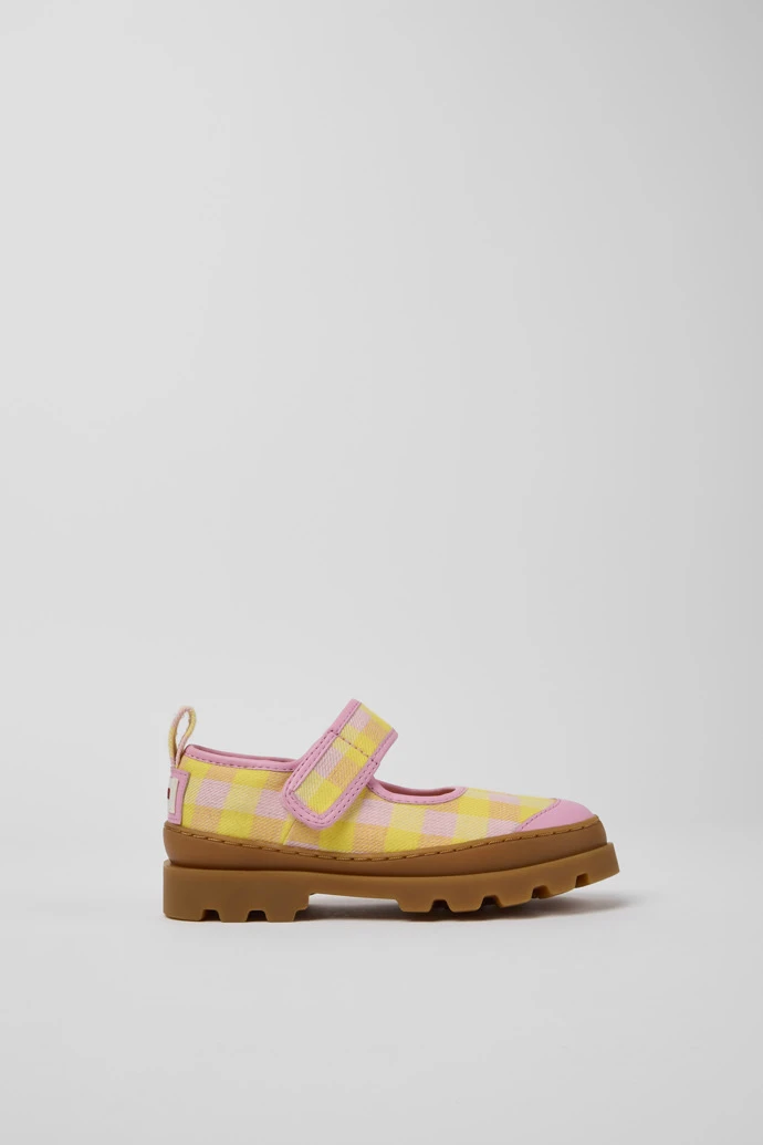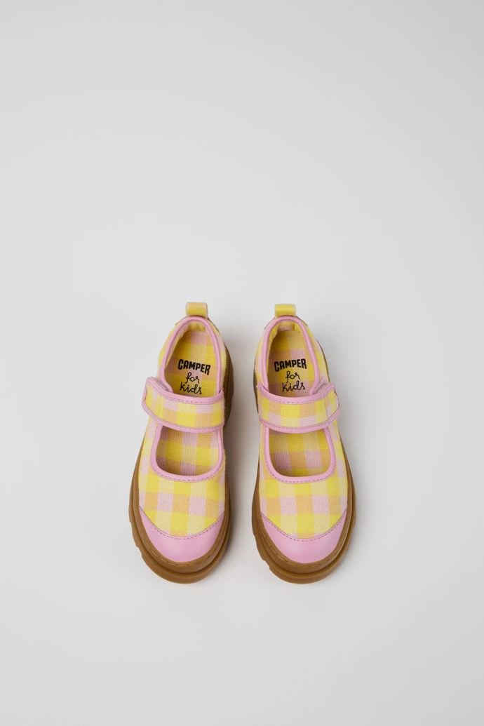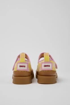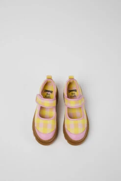 Pink and yellow Mary Jane kids’ shoes made of 65% recycled cotton and 35% recycled polyester with hook-and-loop closing system and 100% rubber outsoles.
