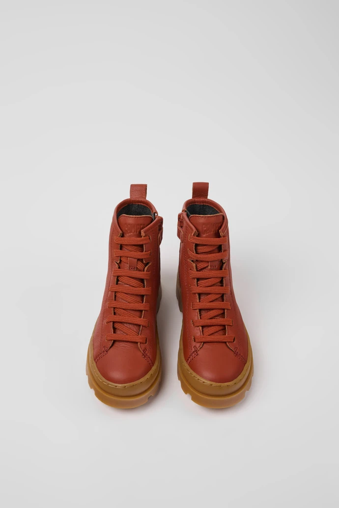 Red leather kids’ ankle boots with OrthoLite® Recycled™ removable footbeds and rubber outsoles.