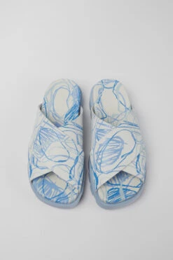 White and blue printed leather women’s sandals with XL EXTRALIGHT® 100% EVA outsoles.