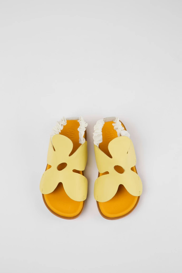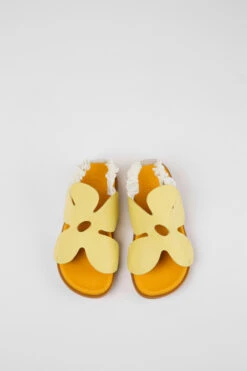 Yellow and brown leather and textile kids’ sandals with oversized flower cut-out, OrthoLite® Recycled™ non-removable footbeds, and rubber outsoles.