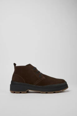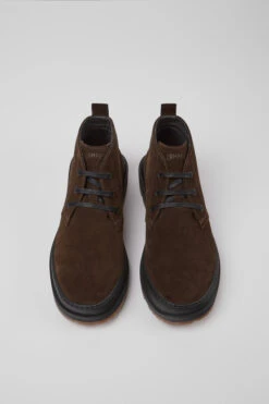 Brown nubuck men’s ankle boots with EVA midsoles, OrthoLite® Recycled™ footbeds, and Michelin rubber outsoles (27% natural).
