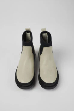 White leather and recycled PET women’s ankle boots with EVA outsoles.