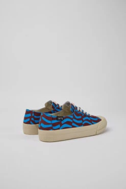 Blue and burgundy 100% recycled cotton women’s sneakers with 23% recycled rubber and 40% natural rubber outsoles.