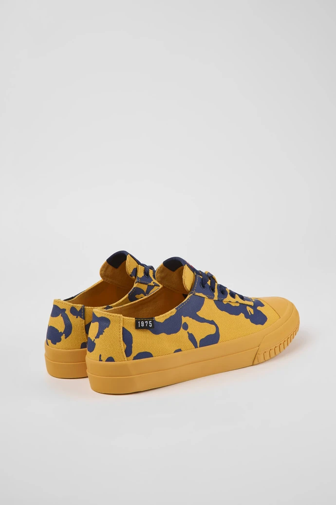 Orange and blue recycled cotton men’s sneakers with OrthoLite® Recycled™ removable footbeds and rubber outsoles (40% natural, 23% recycled).