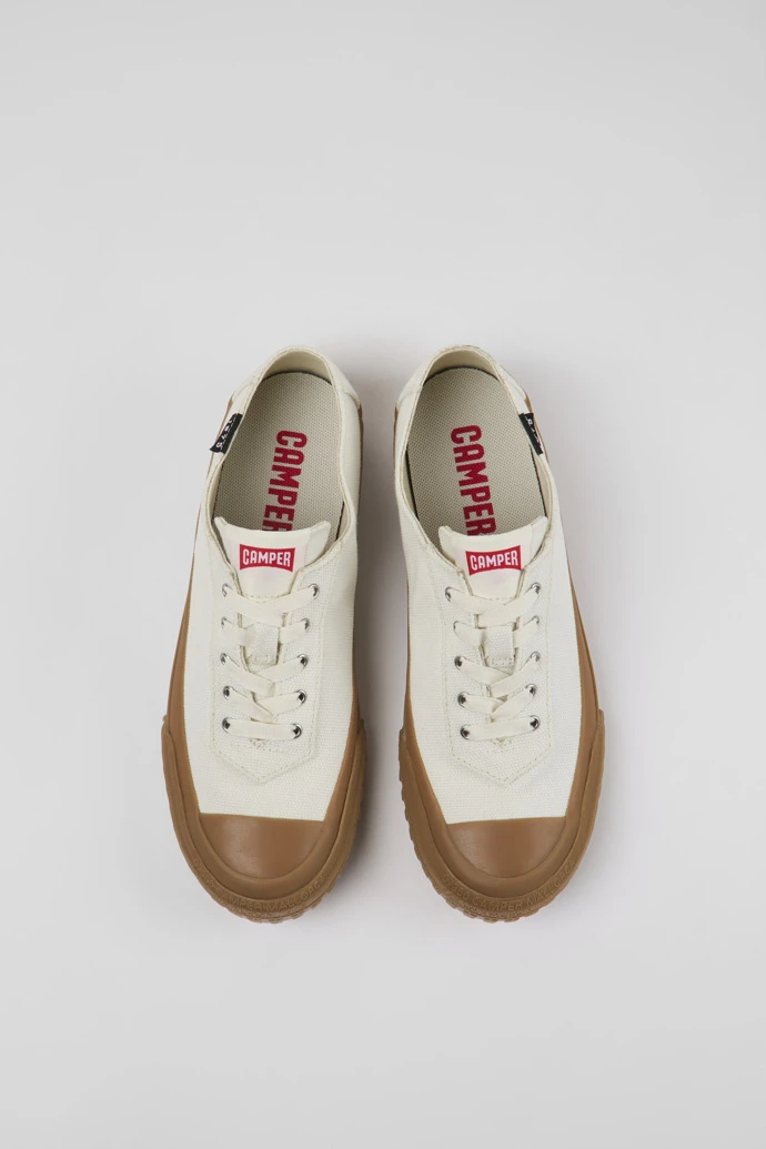 White sneaker for women. Upper with laces, made of 90% natural cotton. 23% recycled brown rubber outsole.