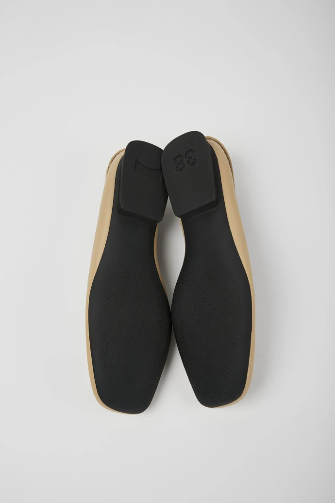 Beige leather women’s ballerina flats with OrthoLite® Recycled™ non-removable footbeds and TPU outsoles (20% recycled).