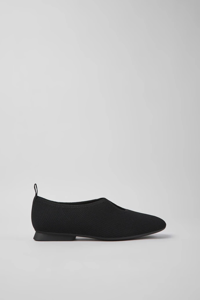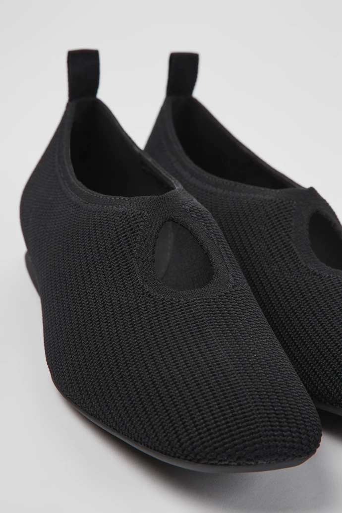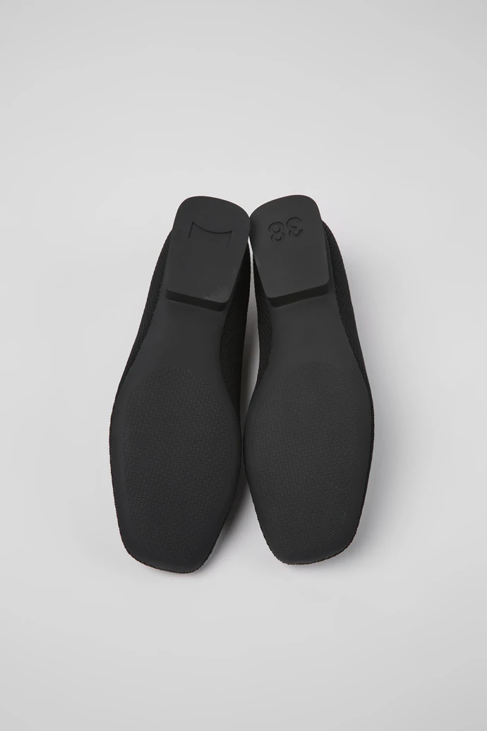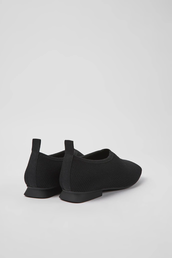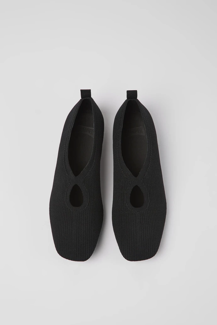 Black recycled PET one-piece knit women’s ballerina flats with OrthoLite® Recycled™ non-removable footbeds and TPU outsoles (20% recycled).