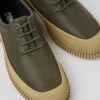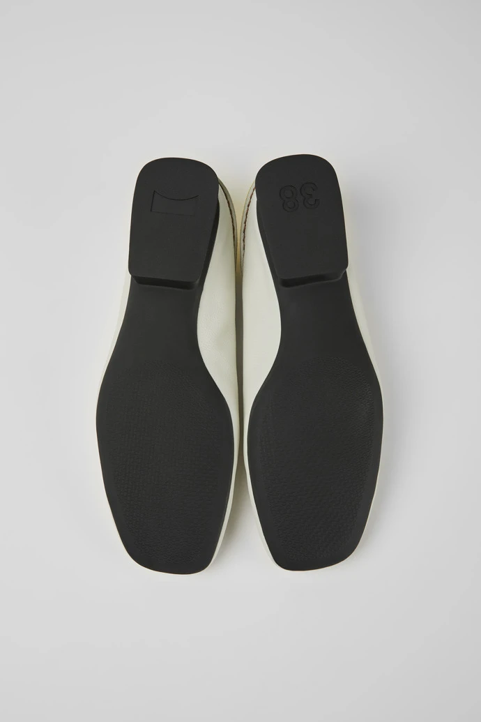 White and yellow leather women’s ballerina flats with OrthoLite® Recycled™ footbeds and TPU outsoles (20% recycled).