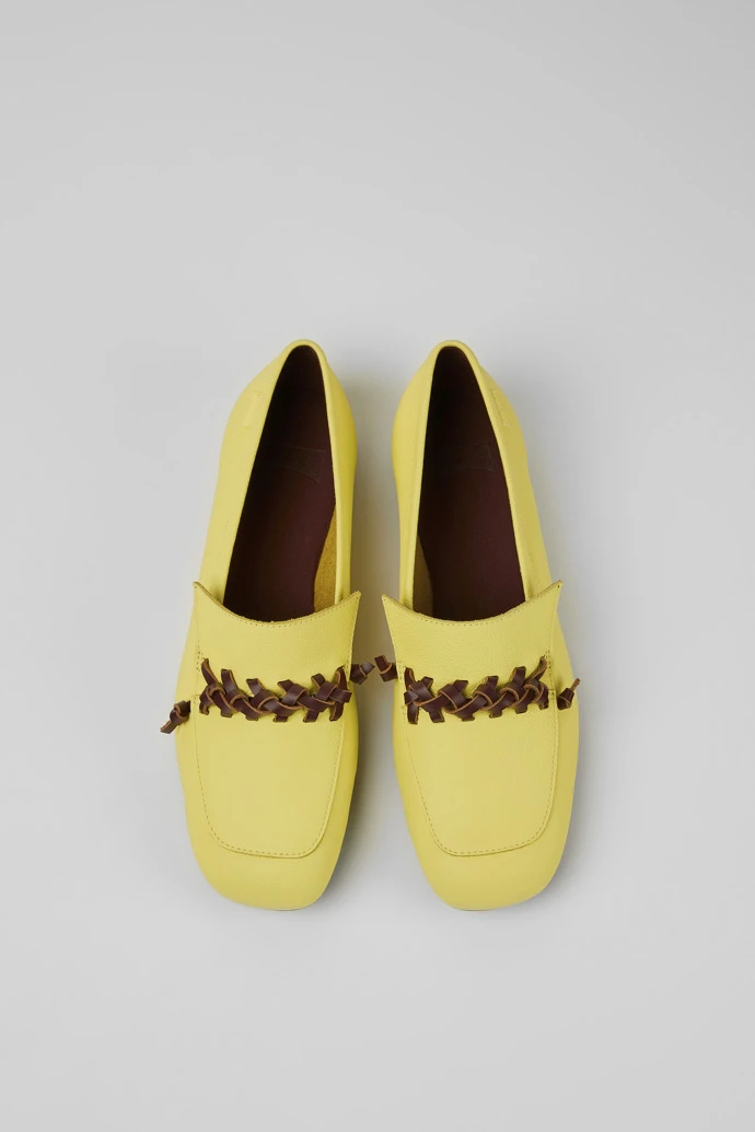 Yellow and brown leather women’s loafers with OrthoLite® Recycled™ footbeds and TPU outsoles (20% recycled).