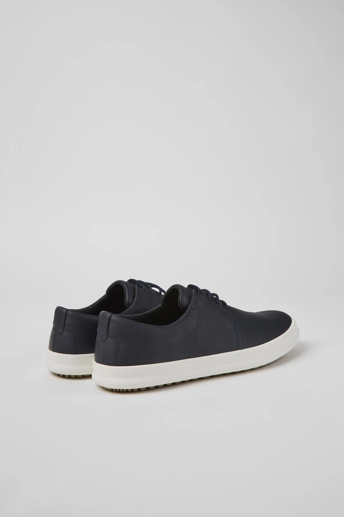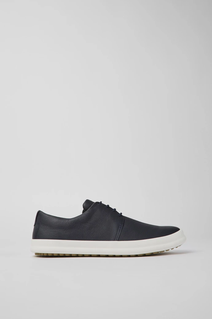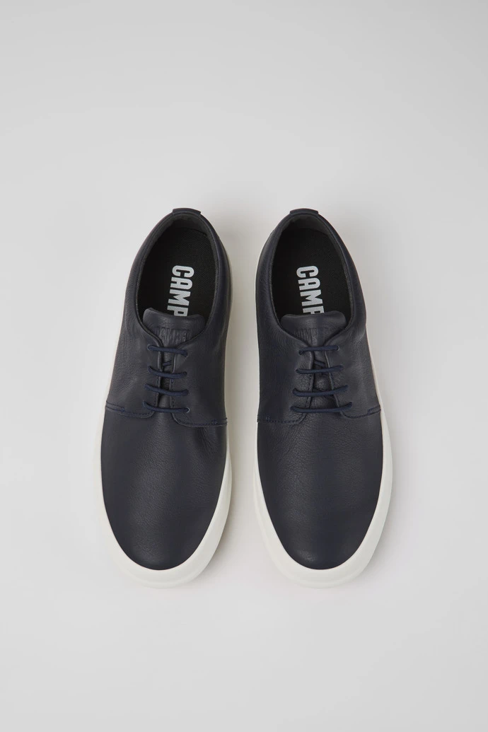 Blue leather men’s shoes with OrthoLite® Recycled™ removable footbeds and rubber outsoles.