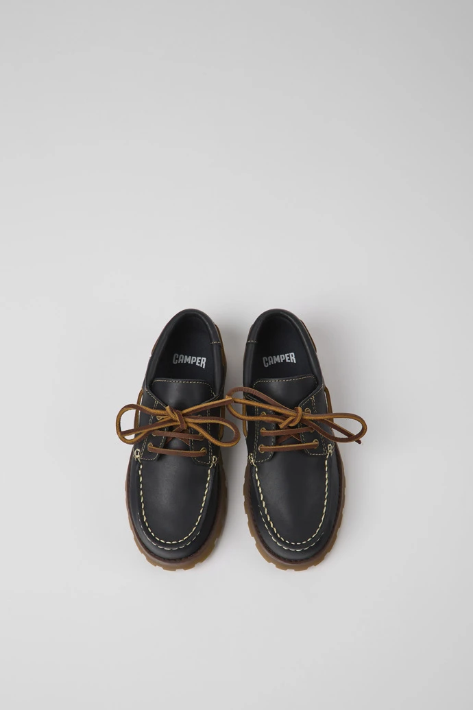 Dark blue leather kids’ shoes with rubber outsoles.