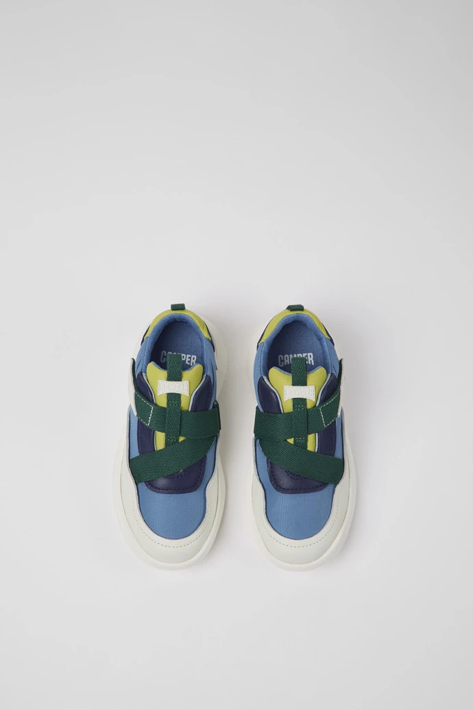 Multicolored leather and textile kids’ sneakers with OrthoLite® Recycled™ removable footbeds and rubber outsoles.
