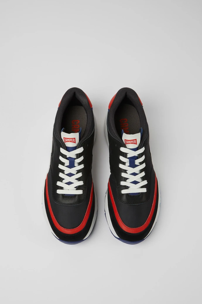 Black and red textile and leather men’s sneakers with PU footbeds and outsoles made of 70% EVA and 30% rubber.