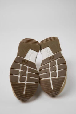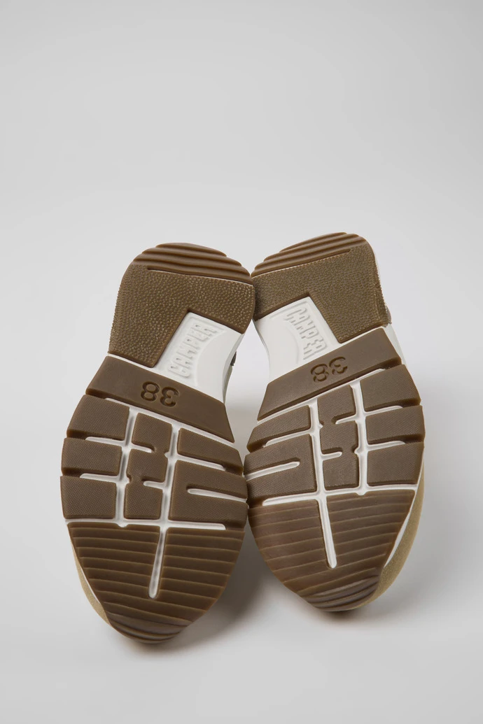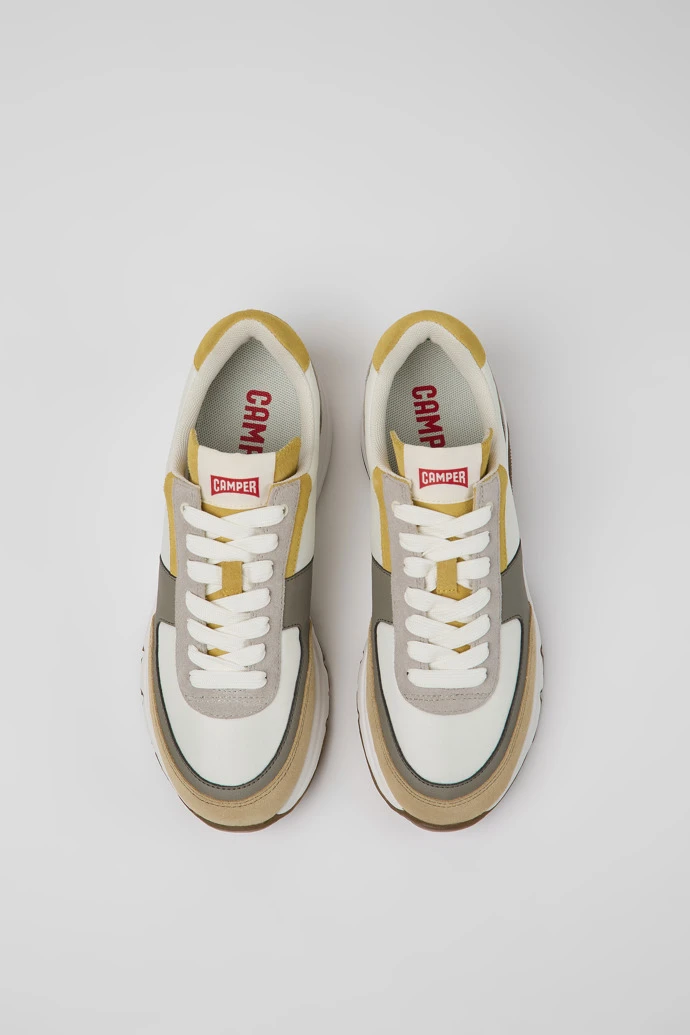 Multicolored lace-up sneaker for women. Yellow, beige and grey upper, made of 39% recycled PET fabric. White and brown 70% EVA and 30% rubber outsoles.