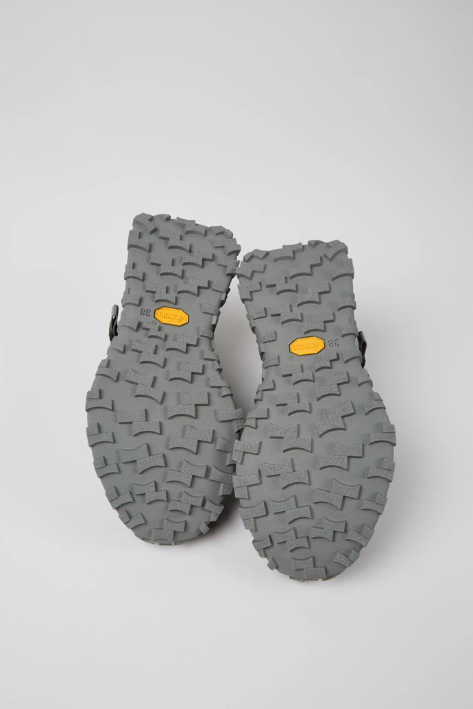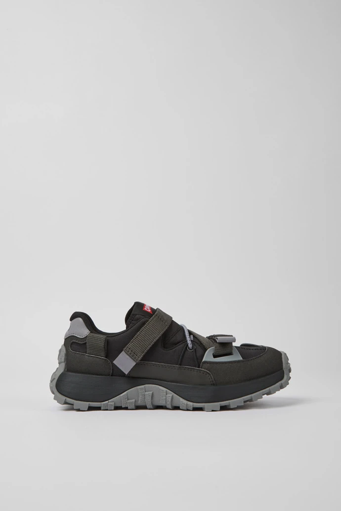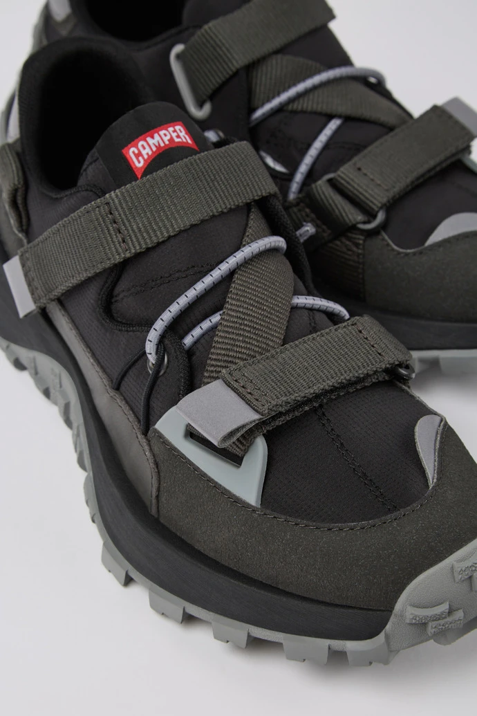 Black and gray textile and nubuck women’s sneakers with OrthoLite® Recycled™ removable footbeds, a hook-and-loop closing system, and Vibram outsoles (30% rubber, 70% EVA).