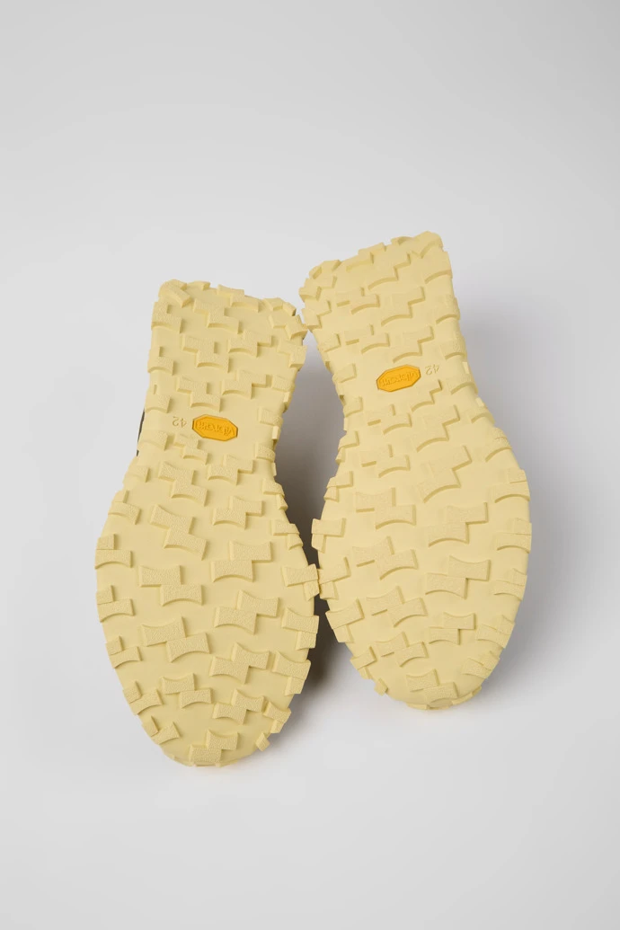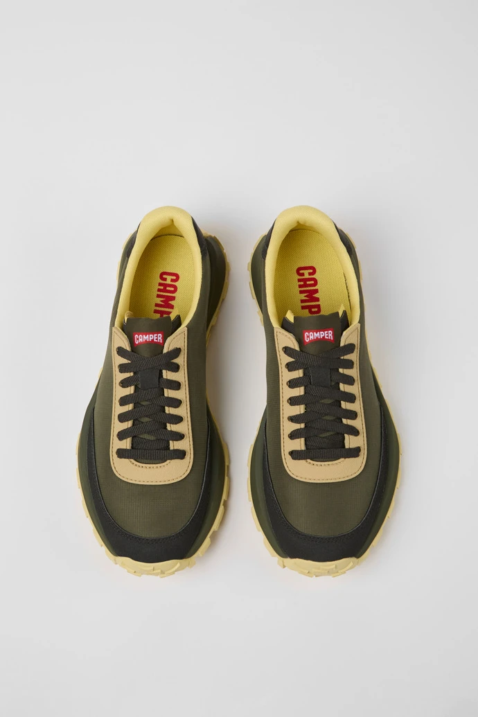 Green textile and nubuck men’s sneakers with OrthoLite® Recycled™ removable footbeds and Vibram outsoles (30% rubber, 70% EVA).