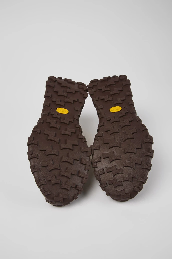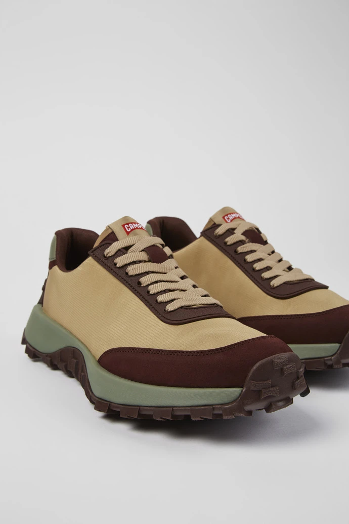 Beige recycled PET and nubuck men’s sneakers with OrthoLite® Recycled™ removable footbeds and Vibram outsoles (30% rubber, 70% EVA).