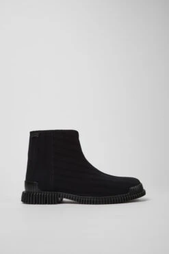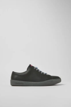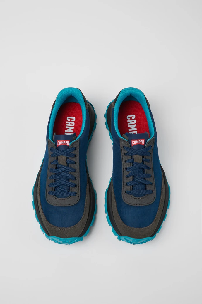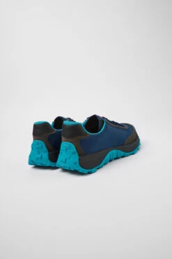 Blue recycled PET and nubuck men’s sneakers with OrthoLite® Recycled™ removable footbeds and Vibram outsoles (30% rubber, 70% EVA).
