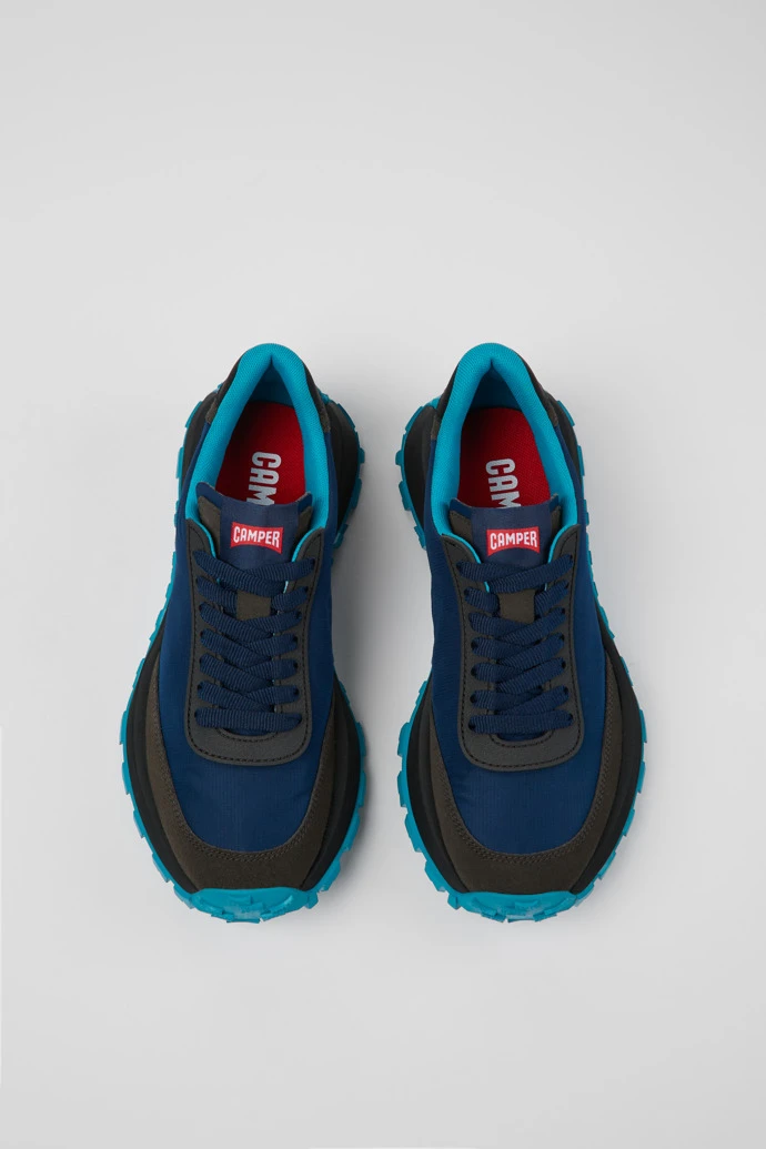 Blue recycled PET and nubuck women’s sneakers with OrthoLite® Recycled™ removable footbeds and Vibram outsoles (30% rubber, 70% EVA).