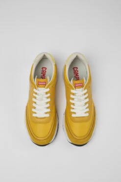 Yellow leather and textile men’s sneakers with PU footbeds and outsoles made with 70% EVA and 30% rubber.