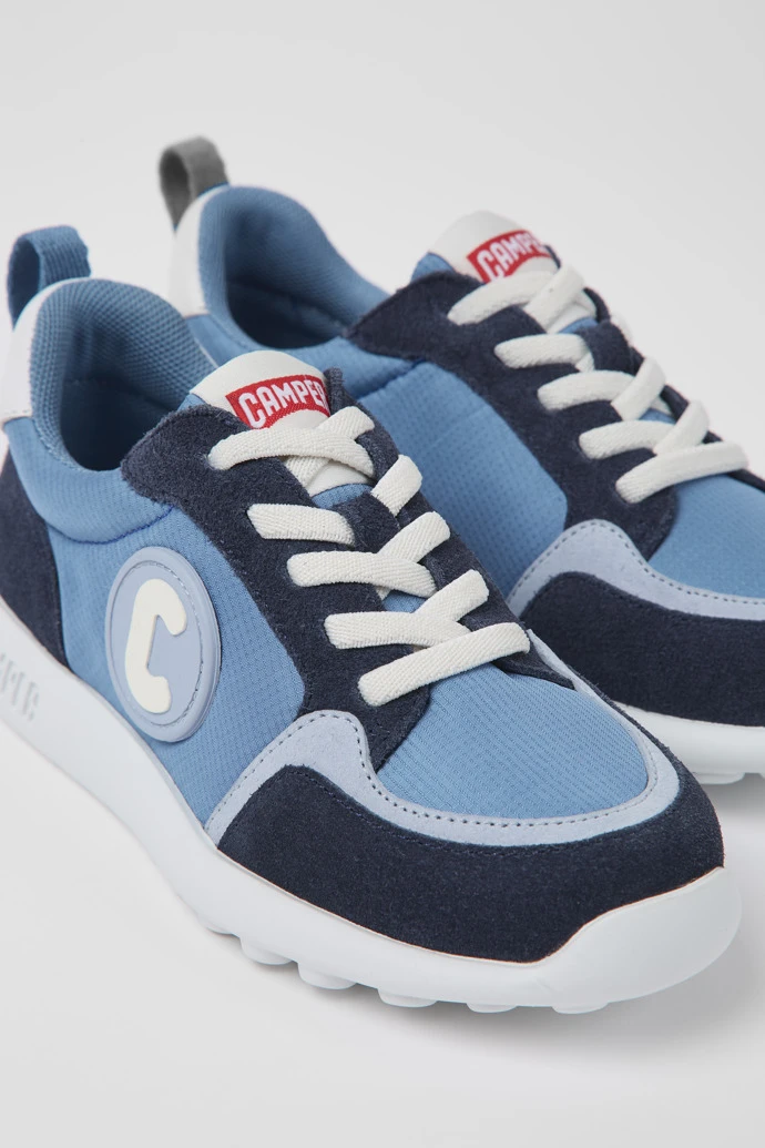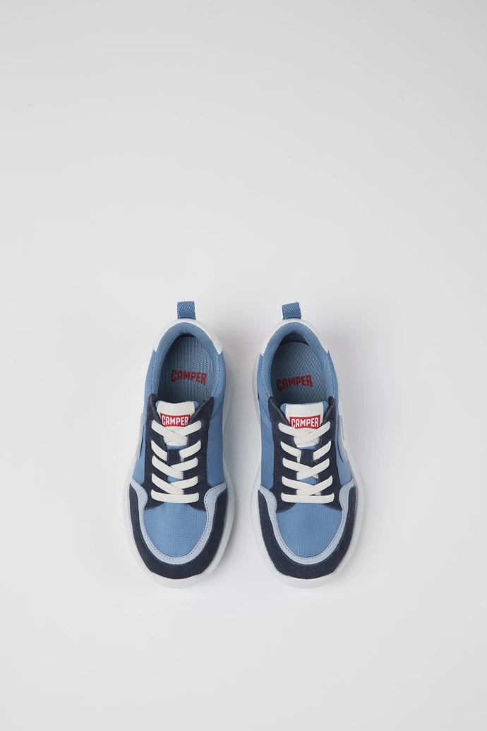 Blue textile and nubuck kids’ sneakers with 75% recycled PET elastic laces and EVA outsoles.