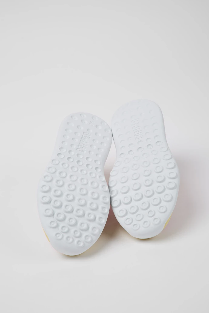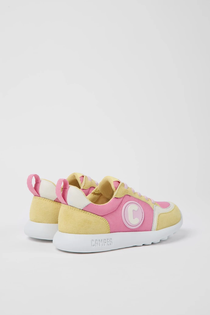 Pink and yellow textile and nubuck kids’ sneakers with 75% recycled PET elastic laces and EVA outsoles.