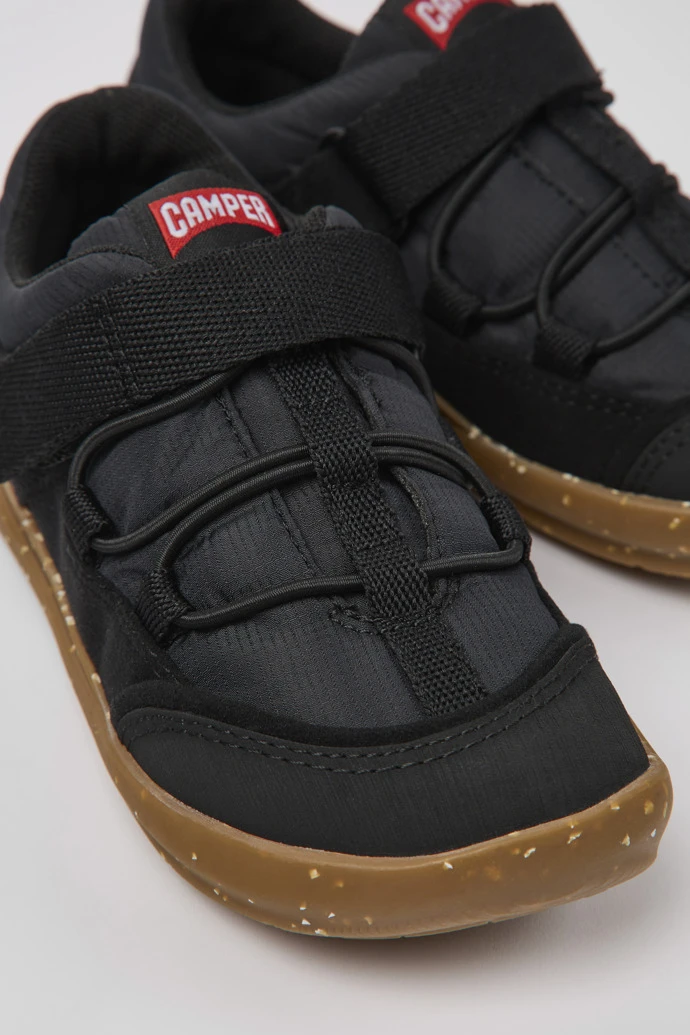 Black textile kids’ shoes with recycled PrimaLoft® technology and rubber outsoles (20% recycled).