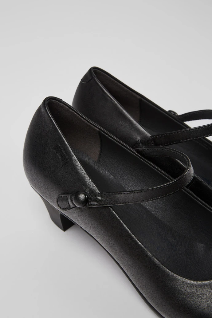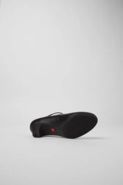 Women’s black full-grain leather Mary Jane with rubber sole.