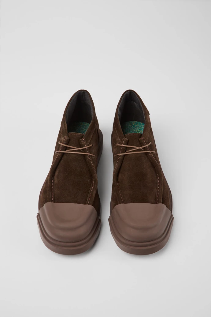 Brown nubuck men’s shoes with removable toe caps, OrthoLite® Recycled™ removable footbeds, and rubber outsoles (40% natural, 23% recycled).