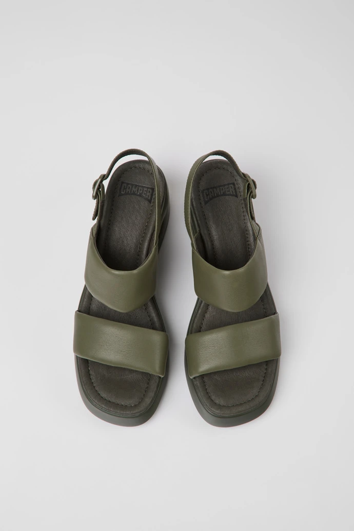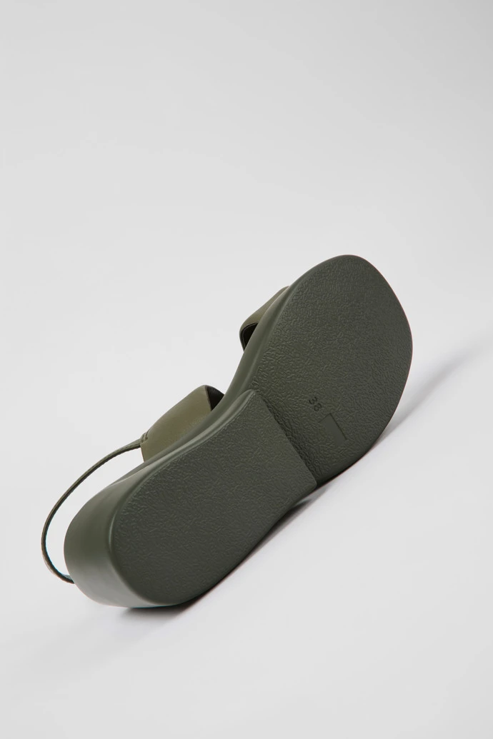 Green leather women’s sandals with OrthoLite® Recycled™ non-removable footbeds and PU outsoles.