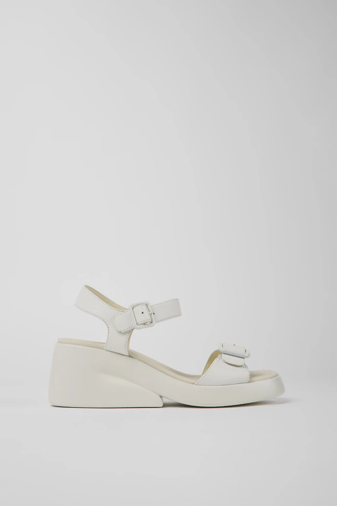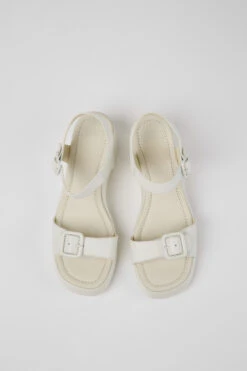 White leather women’s sandals with OrthoLite® Recycled™ non-removable footbeds and PU outsoles.