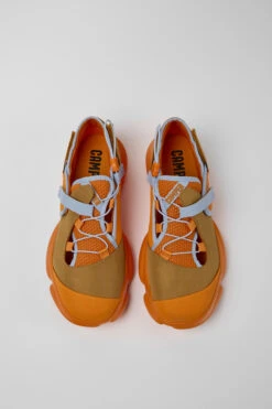 Orange and brown TENCEL™ Lyocell fabric, recycled and organic cotton men’s shoes with XL EXTRALIGHT® Organix™ outsoles (30% bio-based sugarcane).