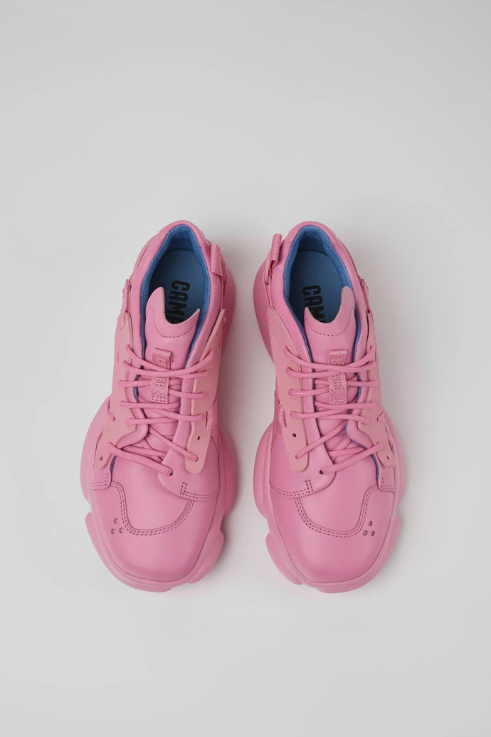 Pink leather and textile women’s sneakers with OrthoLite® Recycled™ removable footbeds and XL EXTRALIGHT® Organix™ 3.0 outsoles (30% bio-circular compounds).